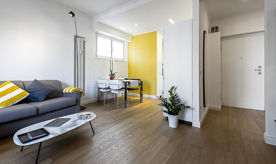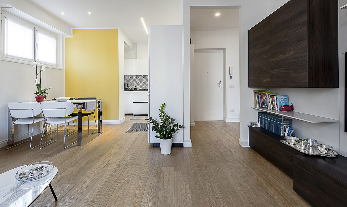 In soggiorno, il pavimento è rivestito, anche nella zona cucina, con parquet in rovere spazzolato [Iperceramica], posato a correre per dare continuità visiva all’ambiente.
