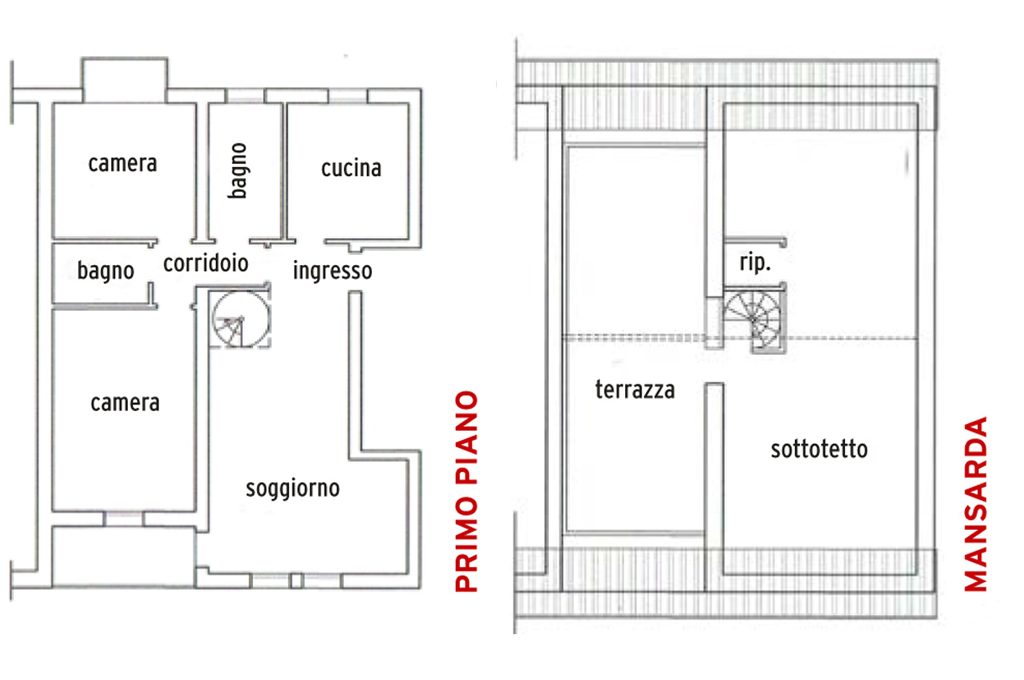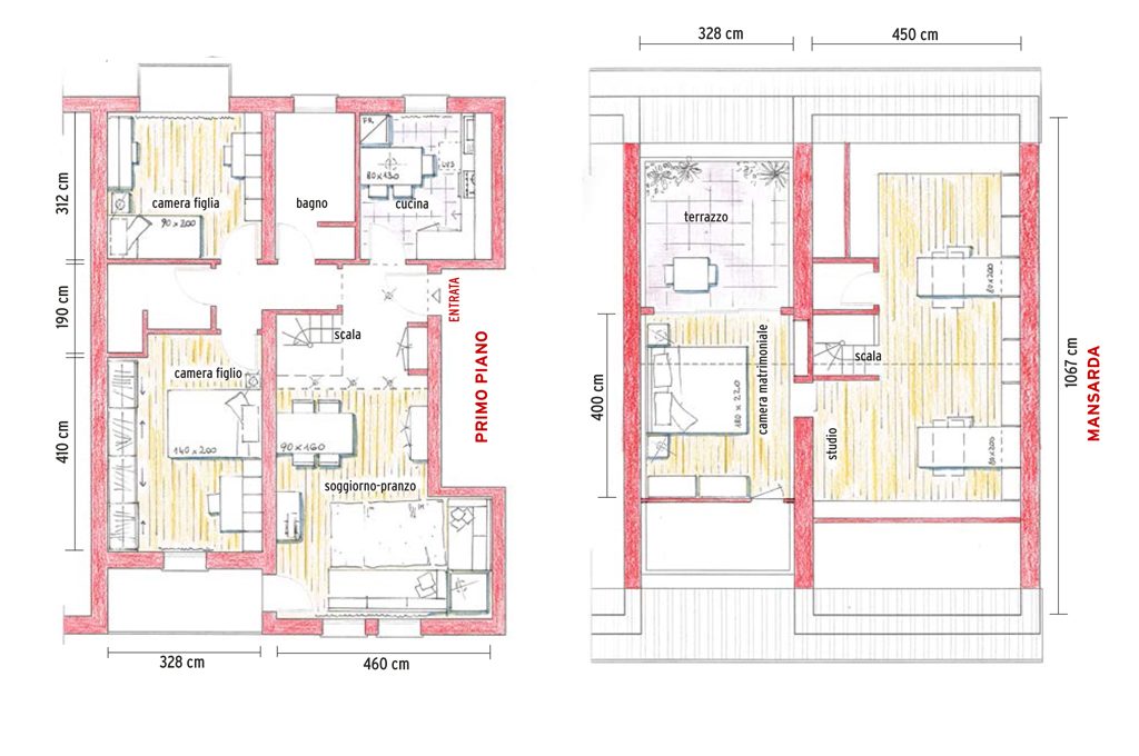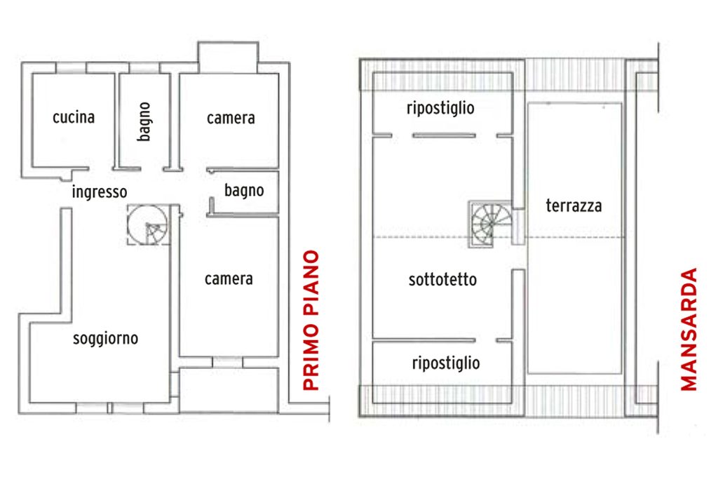• La principale trasformazione riguarda il piano di sopra: la stanza esistente viene dotata di due lucernari e trasformata in grande studio; al posto dello sgabuzzino viene ricavato un bagno (collegando gli attacchi dell’acqua e gli scarichi direttamente a quelli presenti al piano inferiore); infine, parte della terrazza viene chiusa per fare spazio alla camera dei genitori che, così, hanno un balcone privato.