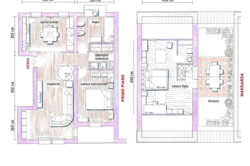 Sara, nostra lettrice di Treviso, doveva risistemare casa: i figli ora adolescenti non possono più dividere la camera da letto e in mansarda c’era un bello spazio da sfruttare come studio, oltre al terrazzo. Così ha contattato lo studio Baldin & Partners (architetti CF Style). Gli architetti Alberta Baldin e Monica Isacco hanno fatto il progetto e seguito la ristrutturazione. Finiti i lavori, la vicina di casa Ida, visto il risultato, ha deciso di affidare allo stesso studio la risistemazione del suo appartamento, simmetrico a quello di Sara: voleva una soluzione per ridare un senso alla casa dove abita con la figlia ventenne. Ecco i due progetti!