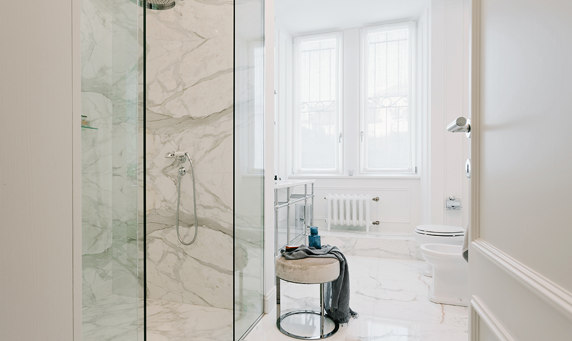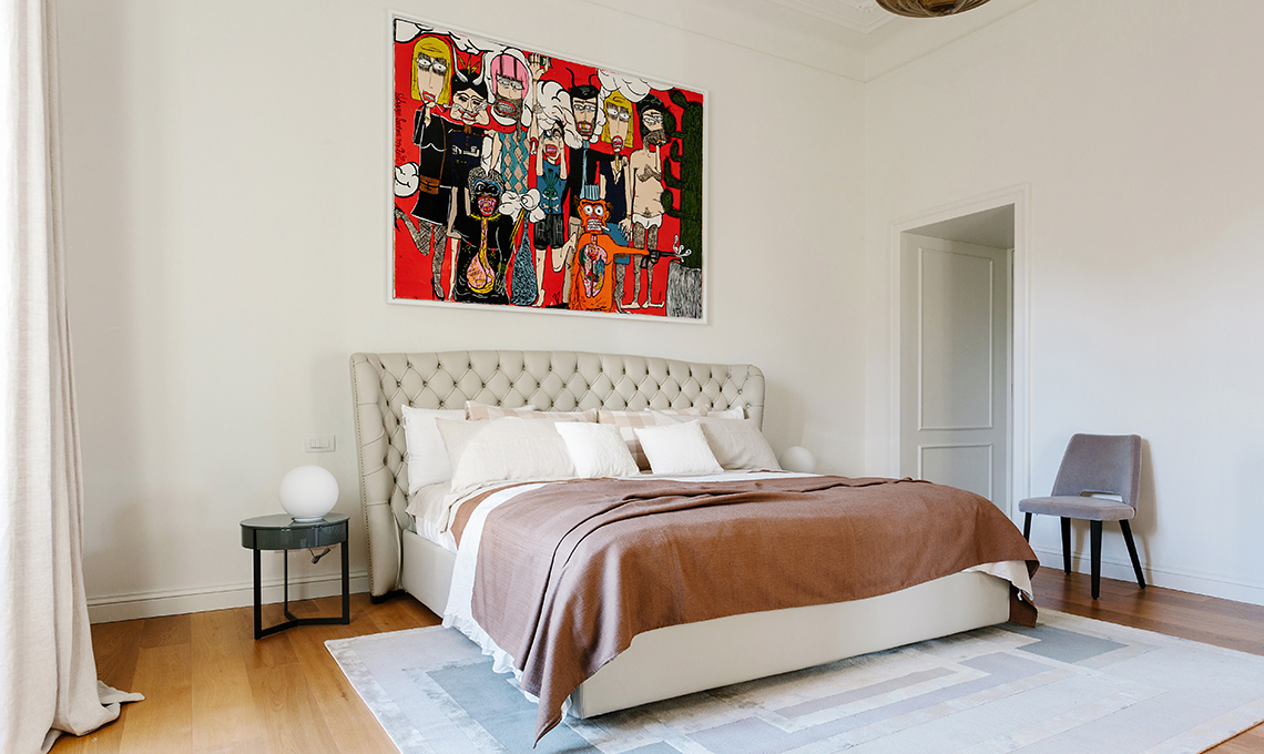 La camera da letto principale è decisamente sofisticata con il letto dall'alta testata capitonné l'armadio realizzato su misura e rivestito in tessuto. Il bagno principale, collegato questa camera è chic e luminoso: il marmo bianco Calacatta dona luce allo spazio che risulta visivamente più ampio. Ospita una maxi doccia e un lavabo old style a consolle.