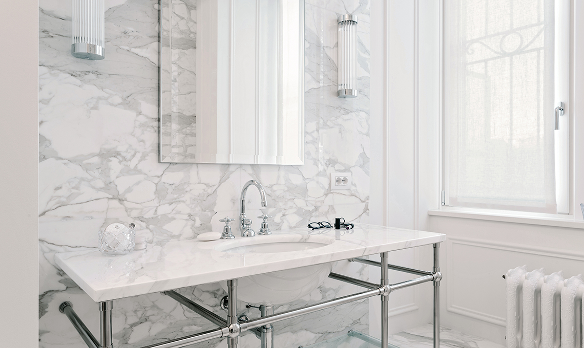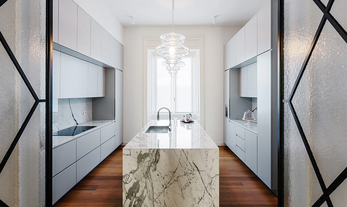 La cucina è stata progettata e realizzata su misura: trionfa al centro l'isola, un blocco di marmo Calacatta, e ancora una volta i lampadari danno un tocco unico all'ambiente creando un mood unico tra classico e design.