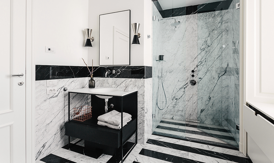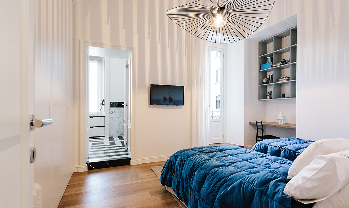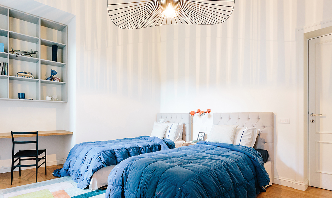 La camera da letto dei figli maschi è molto semplice, con una nicchia trasformata in zona studio e un bagno privato che gioca sui toni del bianco e nero nell'alternarsi dei marmi e nel ferro del mobile bagno a consolle.