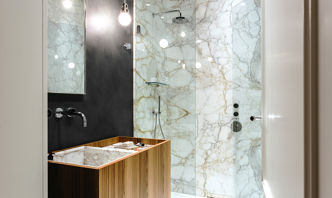 Infine, il bagno per gli ospiti ha le pareti rivestite con una resina grigio scuro e marmo Calcatta Vagli. Il contrasto tra il colore scuro e le vene d'oro del marmo crea un ambiente molto piacevole scaldato dal mobile bagno in legno.