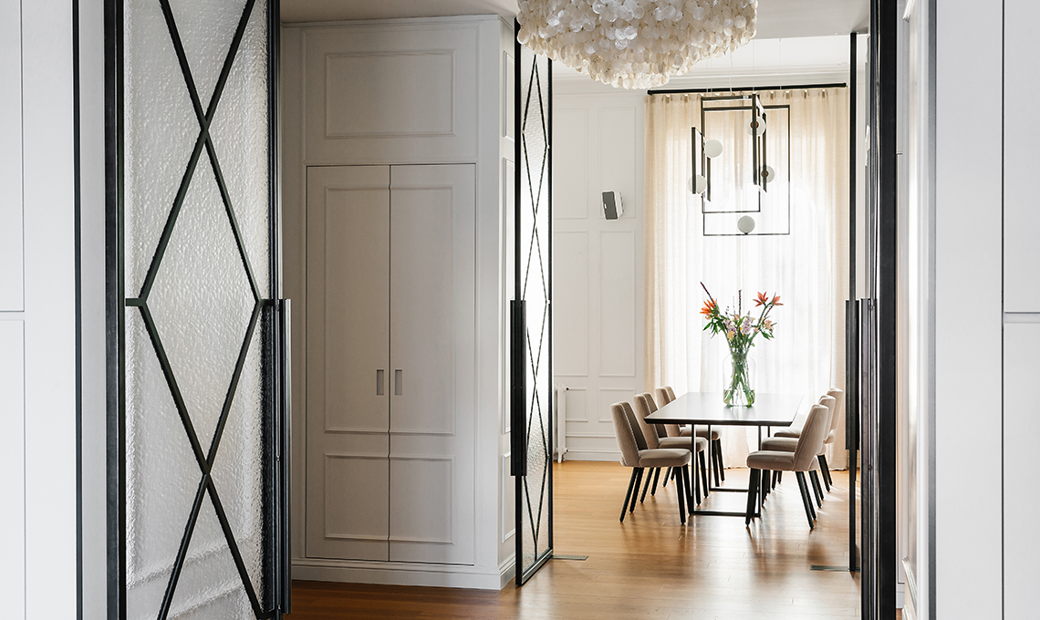 La zona pranzo del soggiorno e la cucina sono collegati visivamente e impreziositi da due porte vetrate disegnate appositamente: quando sono aperte fungono da pannelli decorativi, una volta chiuse separano gli ambienti lasciando passare la luce.