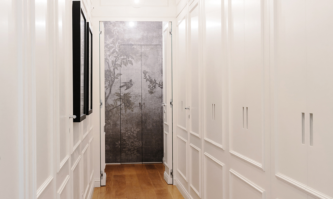 Un lungo corridoio conduce alla zona più intima della casa. Non è solo uno spazio di passaggio perché, riprendendo lo stile dell’ingresso, dietro le modanature intagliate nel legno bianco si celano un armadio da un lato e le porte dall'altro. E in fondo c'è una parete rivestita in carta da parati che 'nasconde' contiene un vano petineuse segreto.