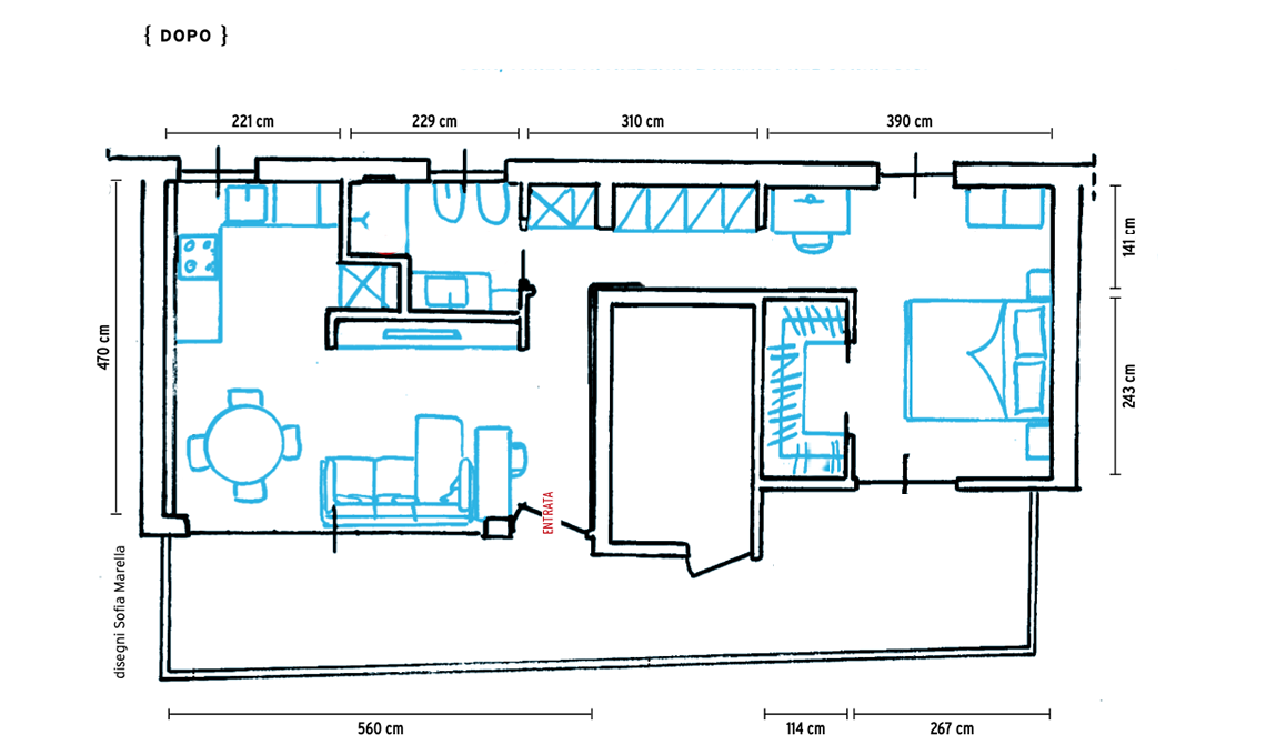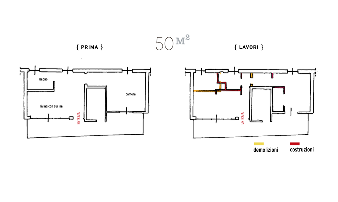 Prima di tutto, il bagno viene slittato verso il corridoio e al suo posto viene organizzata la cucina, parzialmente a vista; entrambi i locali hanno una finestra. Grazie a un gioco di nicchie, la doccia nel bagno e il frigo in cucina vengono incassati, così come la parete attrezzata per la tv in salotto, dopo la realizzazione di due spallette. Installando di fronte all’ingresso una porta vetrata scorrevole esterno muro, è stato realizzato un piccolo disimpegno: grazie ad apposite armadiature a muro, è sfruttato anche come lavanderia e ripostiglio/guardaroba per la biancheria di casa. La camera da letto, che mantiene la posizione precedente, comprende una piccola ma comoda zona studio (l’altra, con un bancone su misura, è stata inserita nel living accanto all’ingresso). Di fronte al letto c’è spazio per una cabina armadio, come era stato richiesto dalla proprietaria: le porte che la chiudono sono a specchio, in modo da ampliare visivamente lo spazio della stanza.