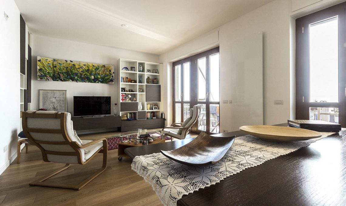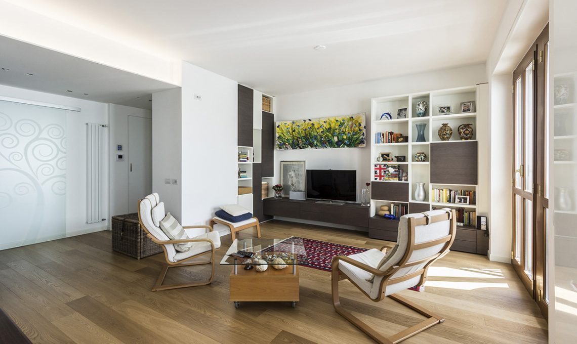 Le nicchie create tra ingresso e soggiorno sono state allestite da un lato con un armadio per riporre i cappotti appena si entra in casa, dall’altro con una parete attrezzata.