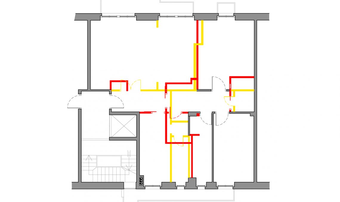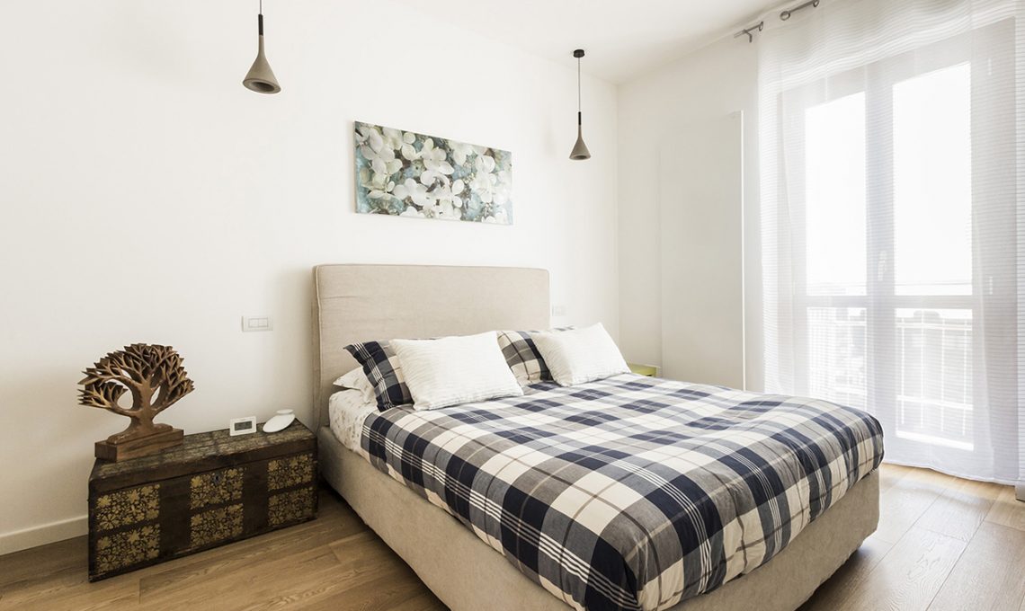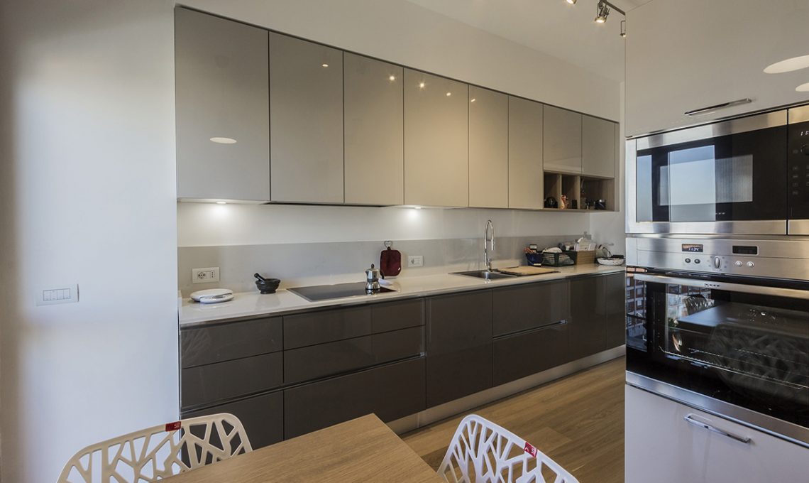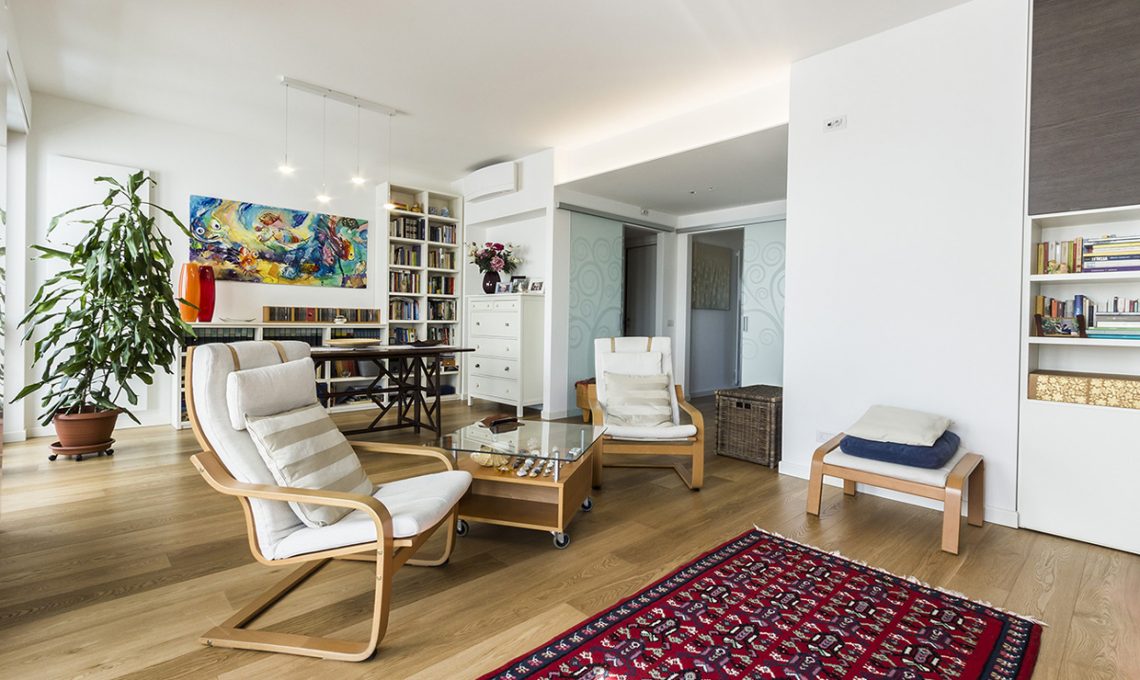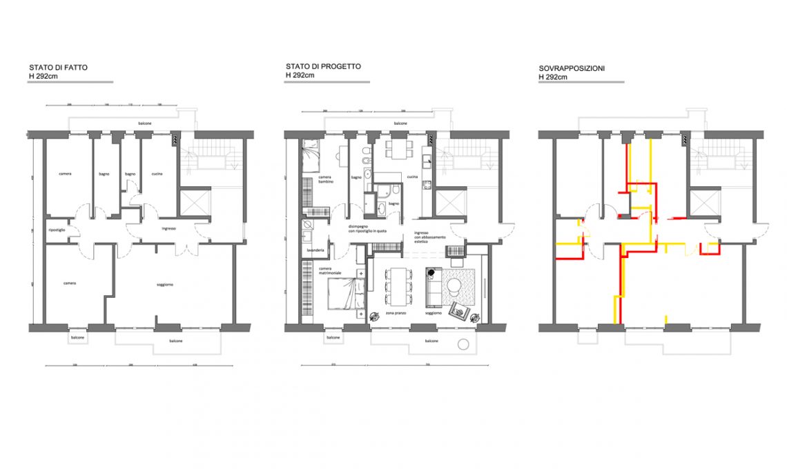 La parete tra soggiorno e camera padronale viene rettificata, mentre tra living e ingresso/corridoio si creano 2 nicchie attrezzate con armadi a muro: all’ingresso per i cappotti e nel corridoio per la biancheria della casa.