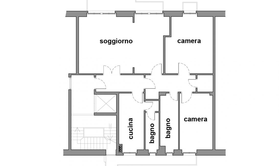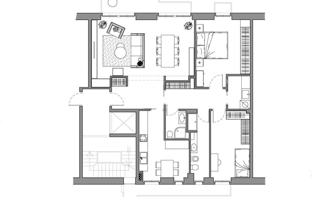 Il bagno piccolo (cieco, con doccia, lavabo e wc) viene spostato verso il corridoio, dal quale è direttamente accessibile; così si può ingrandire la cucina, che diventa abitabile, con 2 finestre e il tavolo per pranzi in famiglia.