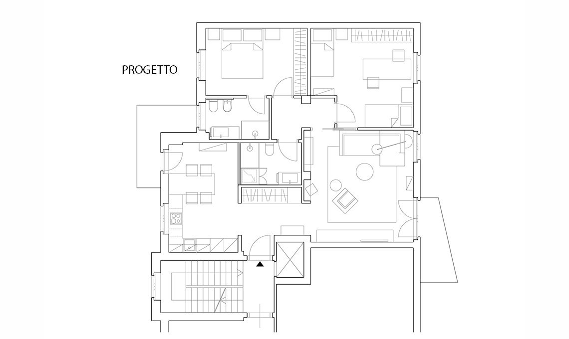 Il classico disimpegno centrale, poco sfruttabile, portava via molto spazio utile: riducendolo allo stretto necessario, sono stati ampliati soggiorno e cucina e c’è posto per il secondo bagno