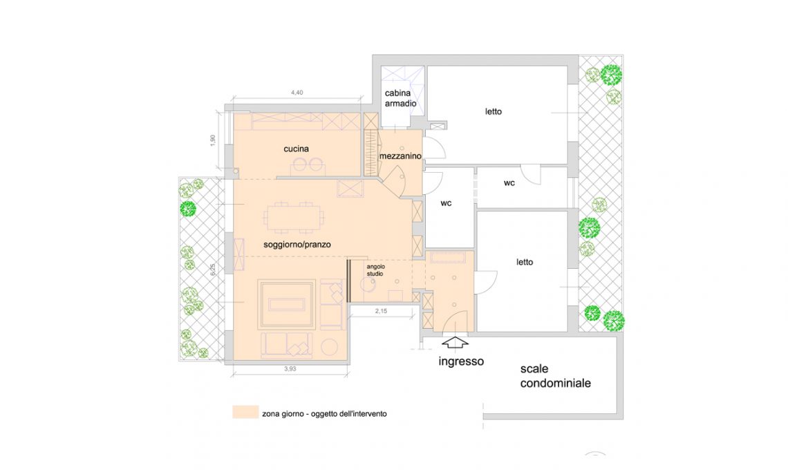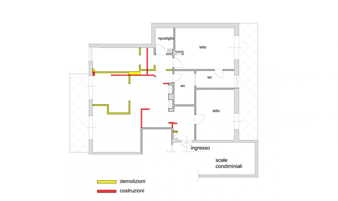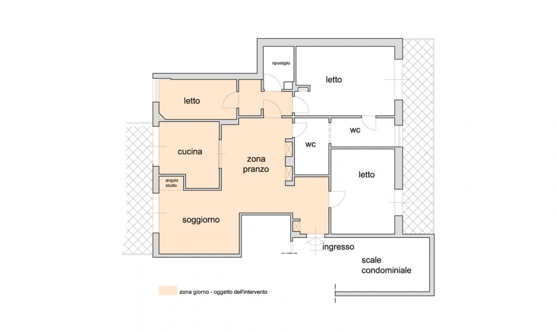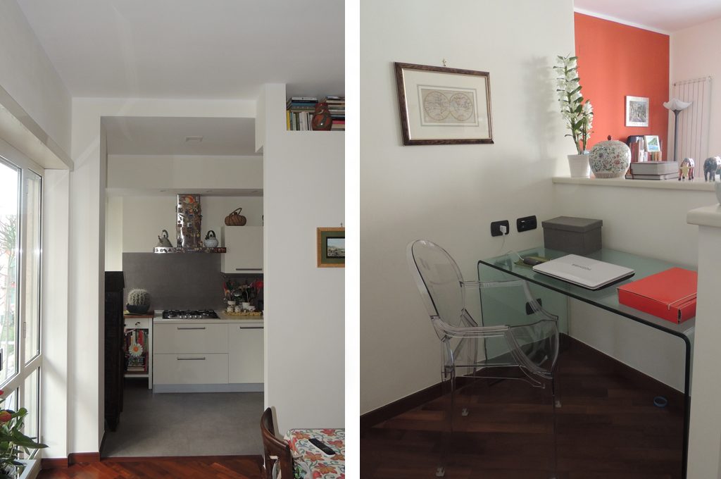 Il progetto: la cucina si sposta dove c'era la cameretta in modo da lasciare più ampio e fluido il soggiorno che, ora riesce ad ospitare anche una zona studio tra ingresso e soggiorno.
