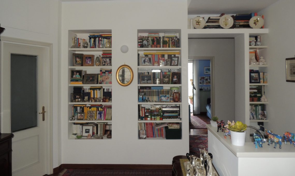 L’angolo studio viene ricavato tra l’ingresso e la zona conversazione, dalla quale è separata da un muretto alto cm 120. La parete alle spalle della scrivania viene ‘movimentata’ da nicchie in cartongesso, con mensole per fare posto ai tanti libri.