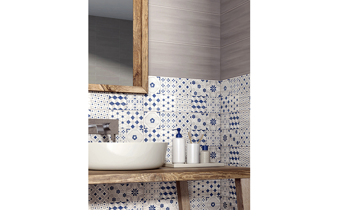 Un tocco vintage nei bagni: le pareti sono state rivestite con le piastrelle Paint in pasta bianca nella tonalità grigio/blu, che riprendono i decori tipici delle vecchie cementine [Marazzi, cm 20x50].