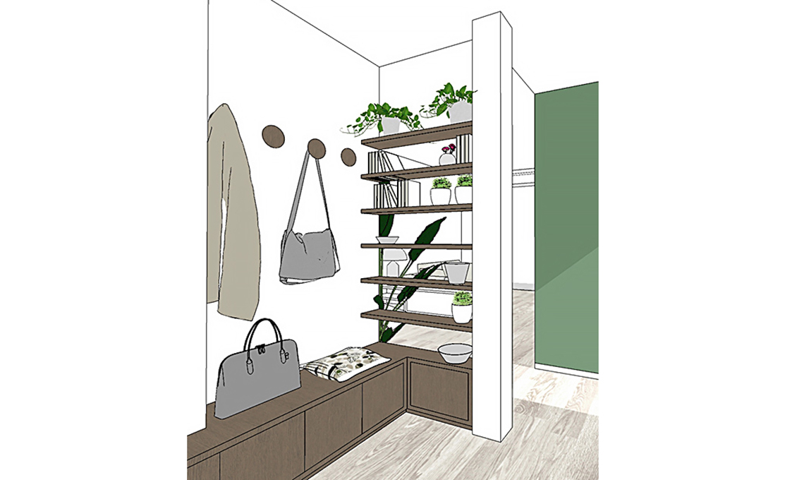 con un pilastro in cartongesso e mensole in legno. Dalla parte dell’ingresso, inoltre, una panca a elle a alcuni appendini sul muro servono per riporre borse, scarpe e cappotti