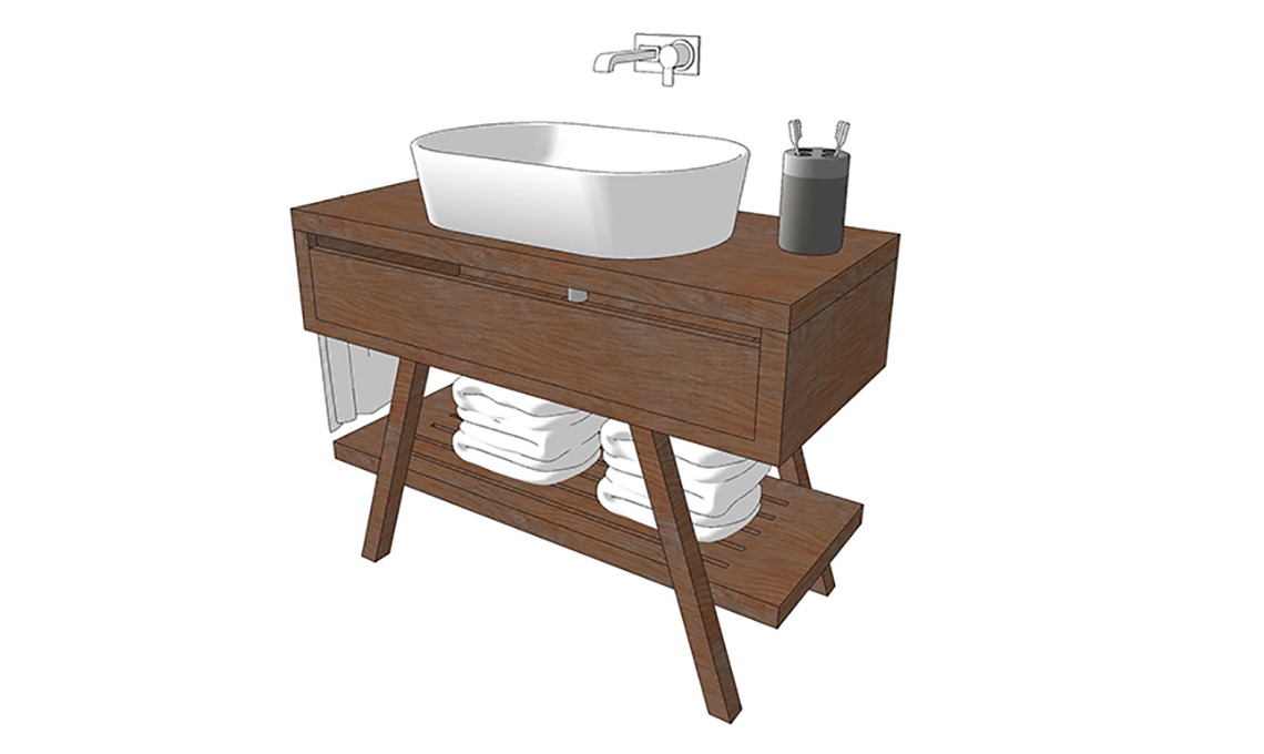 L’architetto ha disegnato anche il mobile per il lavabo da appoggio del bagno principale. Ha una struttura a cavalletto