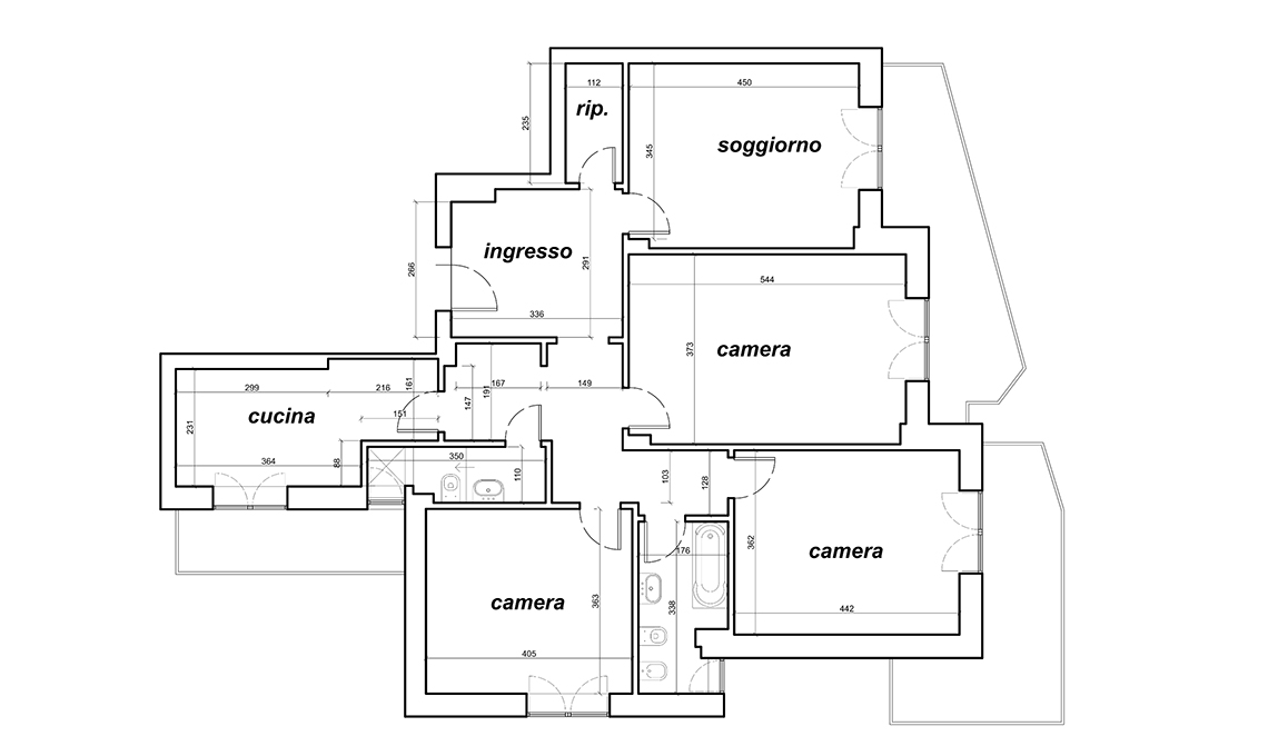 Il progetto del quadrilocale da 115 mq. Il soggiorno era troppo piccolo, la cucina sacrificata e lontana dal soggiorno; il 2° bagno era minuscolo. ● Eliminato il ripostiglio vicino all’ingresso, è stato ingrandito il living, che ora è una maxi-zona relax. ● La cucina ha preso il posto di una delle camere: più che raddoppiata nelle dimensioni, adesso ospita anche la zona pranzo. ● Al posto della vecchia cucina è stato ricavato uno studio, con poltrona letto per gli ospiti. ● Il bagno padronale è stato leggermente ingrandito, così come quello di servizio che risulta ben fruibile. Di fronte a questo si è ricavato anche un nuovo ripostiglio. ● per desiderio dei proprietari, cucina e soggiorno sono separati. sarà possibile, in un secondo momento, mettere in contatto i due locali spostando i moduli della libreria e aprendo un varco nella parete divisoria.