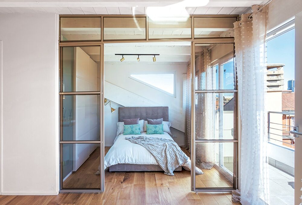 Demoliti i tramezzi per ridistribuire gli ambienti, si è creata, accanto all’ingresso, un’ampia zona living/pranzo separata dalla cucina da porte scorrevoli a tutta altezza in vetro fumé con rete metallica: per le cene con amici, il bancone della penisola si aggiunge al tavolo semplicemente ritraendo le ante scorrevoli. La cucina ha su un lato le colonne frigo, il freezer e i forni, e su quello opposto le basi con la zona operativa che proseguono nei mobili della zona pranzo. In soggiorno, oltre alla libreria a tutta altezza c’è un mobile tv che, verso l’ingresso, ha colonne contenitive per i cappotti. Dal disimpegno della zona notte con armadio lavanderia si accede alle camere dei ragazzi, che condividono il bagno, e alla camera matrimoniale dotata di armadi ma anche di un’ampia cabina e di un bagno en suite. Su richiesta dei proprietari, l’impianto elettrico è stato realizzato in domotica, in modo da poter controllare da remoto le funzioni della casa.