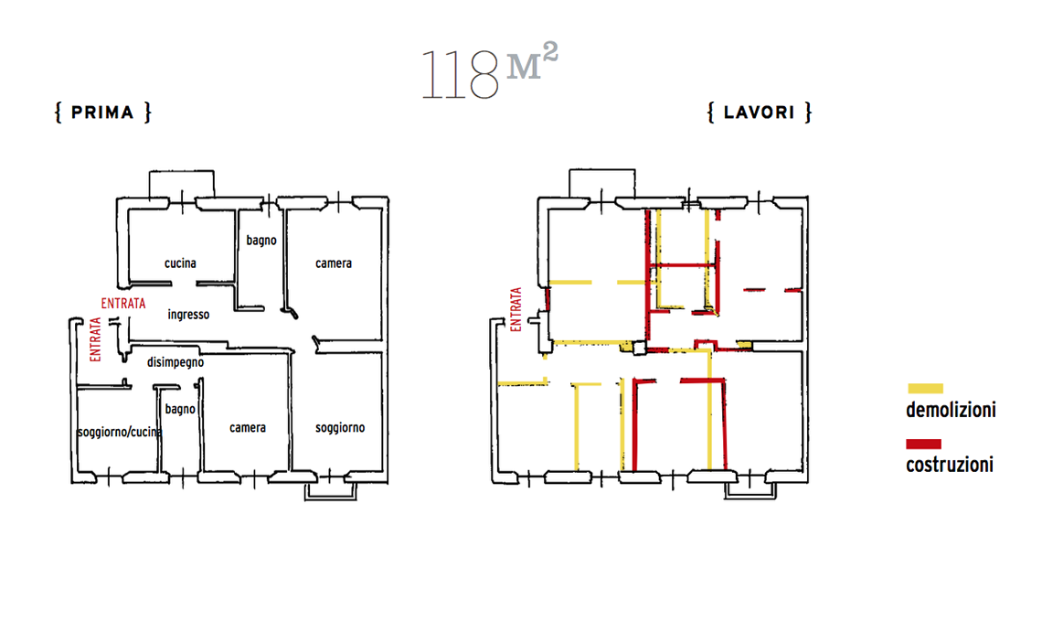 Un bilocale e un trilocale, piccoli e con molti spazi sprecati, vengono uniti per ridisegnare un appartamento ampio ma comodo per una famiglia con figli adolescenti. Obiettivo: ricavare tante armadiature in ogni stanza.