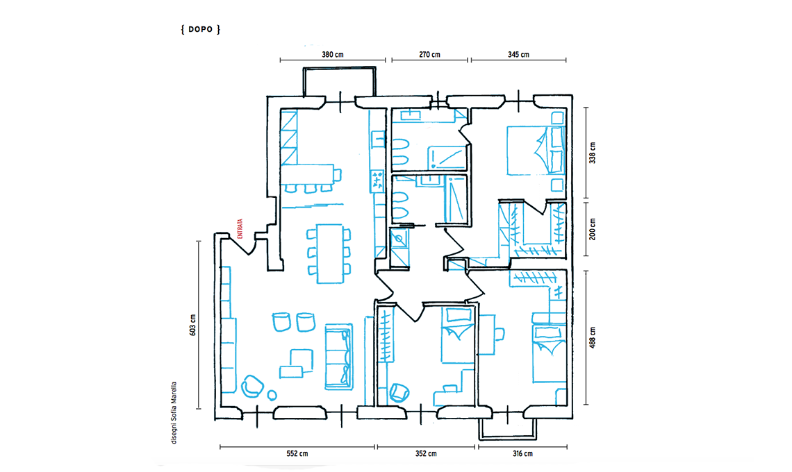 Una famiglia con due figli adolescenti ha l’esigenza di dare a ciascuno una stanza. Anziché cambiare casa, nasce l’idea di unire due appartamenti già di proprietà: un bilocale e un trilocale adiacenti ristrutturati negli Anni ’60. All’architetto CF style Valeria Sangalli chiedono di ricavare 3 camere da letto, un ampio living con tanti contenitori, una cucina separata ma affacciata sul soggiorno e soprattutto tanti armadi.