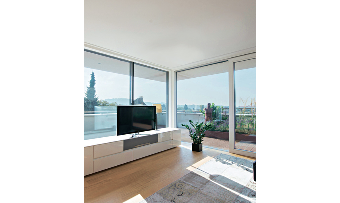 Finestra scorrevole alzante KS430 in pvc-alluminio: può essere realizzata in grande formato, fino a m 5,8x2,8 e ha elevate prestazioni nell’isolamento termico [Internorm].