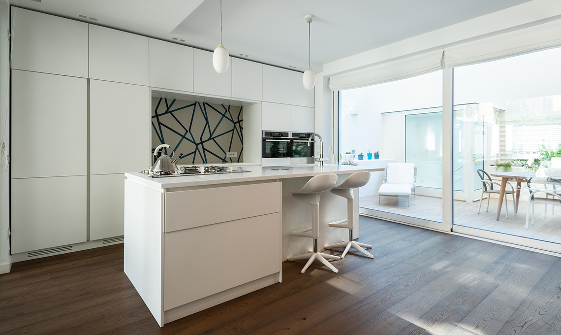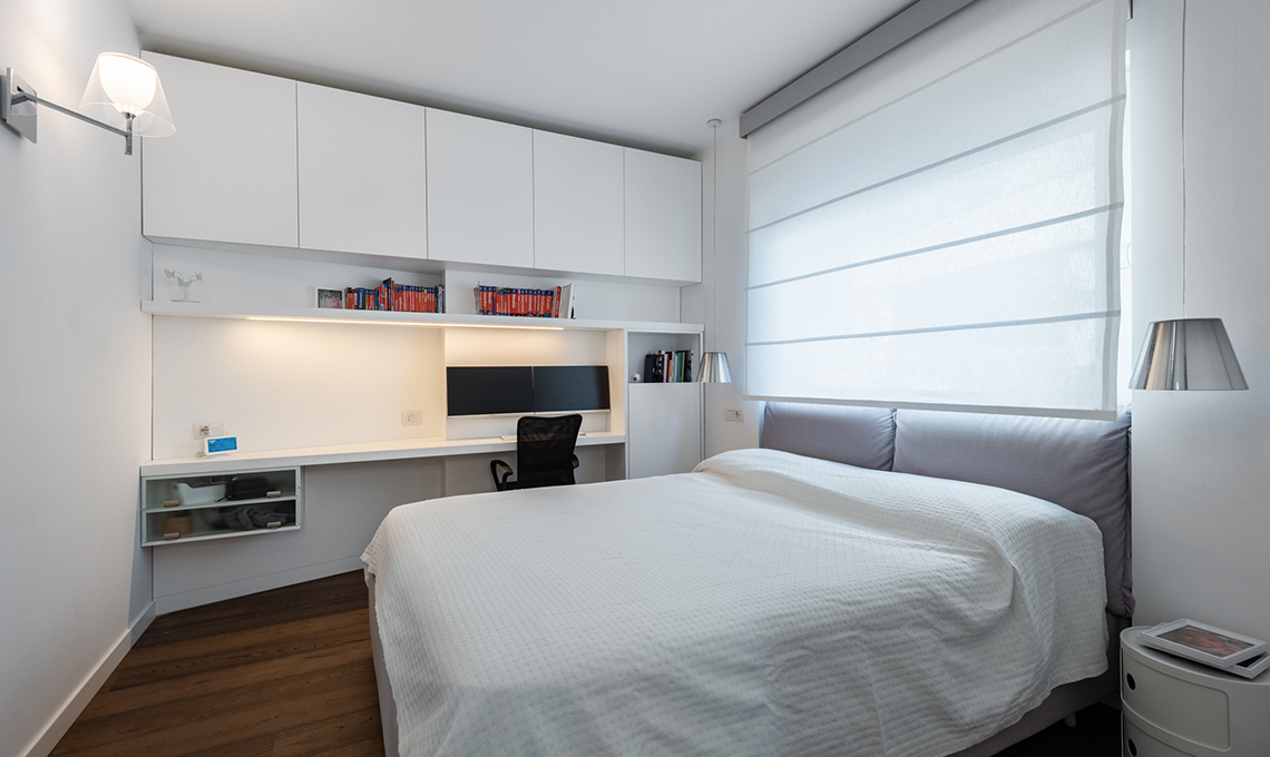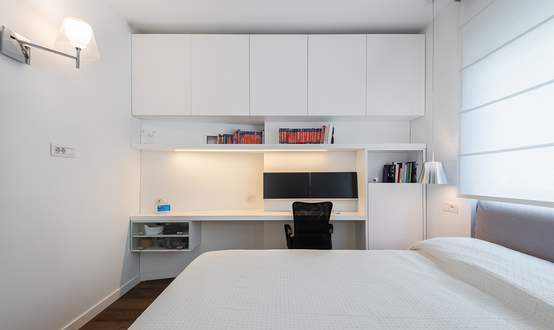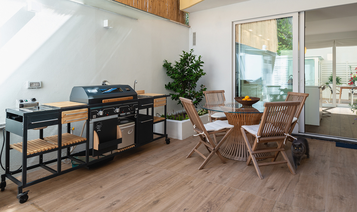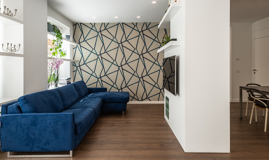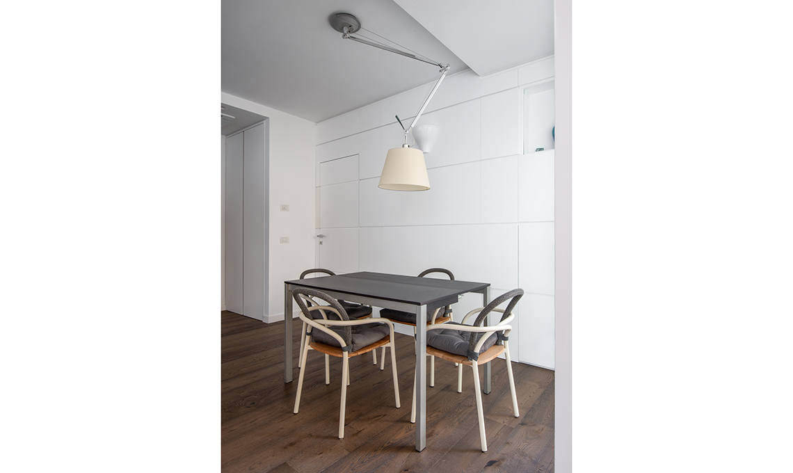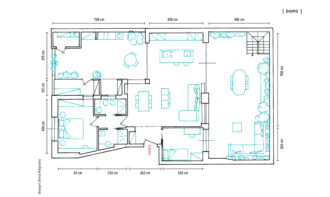 Demolite tutte le partizioni interne e parte dei muri esterni per creare nuove grandi aperture che consentissero una migliore illuminazione degli ambienti (è bastato presentare la SCIA*), l’appartamento che in fase iniziale aveva una zona giorno lunga e stretta, una camera da letto e un solo bagno ora è totalmente riorganizzato e adatto a una famiglia con figli. Eliminato anche il ripostiglio interno, il living – ora a elle e con doppio affaccio – ha una maxi cucina con isola e le zone relax e pranzo separate da un mobile a tutt’altezza che ingloba e nasconde il pilastro centrale. La vecchia camera da letto è stata ridimensionata per realizzare il secondo bagno, ed è dotata di home office e accesso diretto alla cabina armadio, ricavata rubando un po’ di spazio al cortile. La cameretta, accanto all’ingresso, si affaccia sul secondo giardino ed è ‘mimetizzata’ da una parete rivestita con carta da parati e porta a scomparsa filomuro. Alla zona notte e servizi si accede attraverso una parete boiserie con porta a scomparsa. E i due spazi esterni ospitano cucina e living outdoor. Tutto in soli 75 (+ 75) mq!