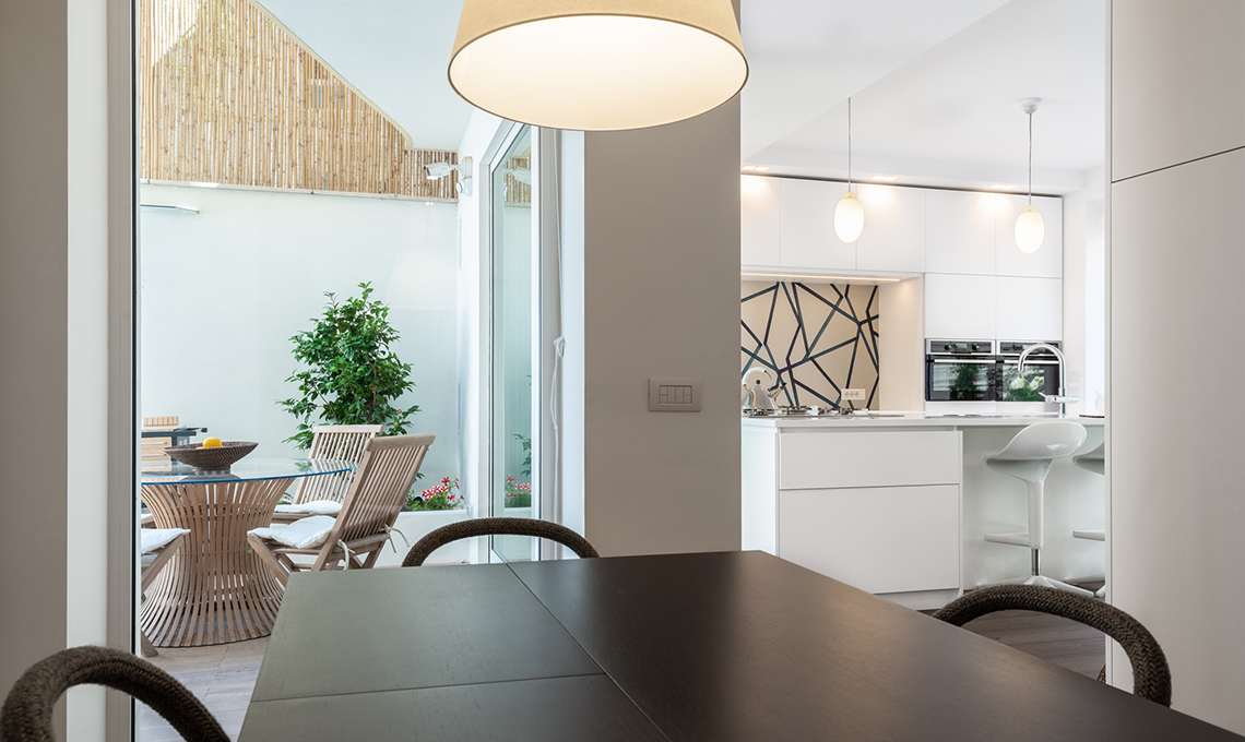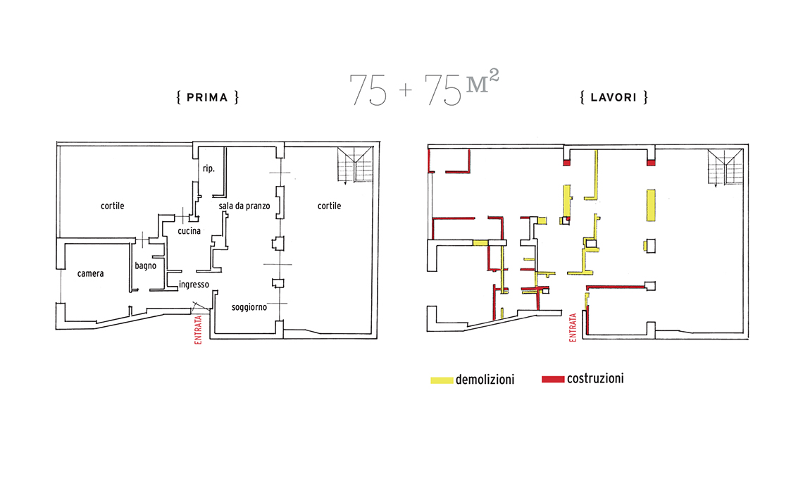 Un appartamento seminterrato nel cuore di Roma, chiuso fra altri palazzi: la luce è poca, gli spazi divisi male e in modo rigido, ma i due cortili privati con una superficie complessiva pari a quella interna hanno convinto i proprietari all’acquisto e con l’intervento dello studio CF style EmmeQ la scommessa di trasformarlo in una casa davvero unica è stata vinta: spazio e luce sono raddoppiati!