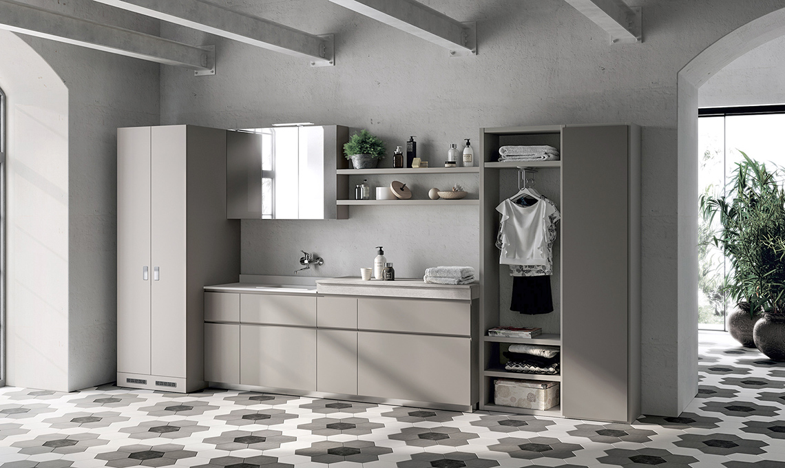 Crea la lavanderia ideale con gli arredi Rivo integrati da elementi Laundry Space: da destra, armadio per lavatrice e asciugatrice, base con lavatoio e asse lava-panni removibile, pensile con stendino telescopico Smart e base con piano a ribalta Cover con asse da stiro estraibile [Scavolini Bagno].