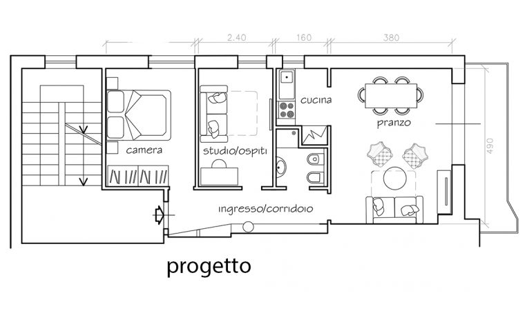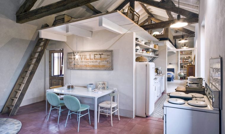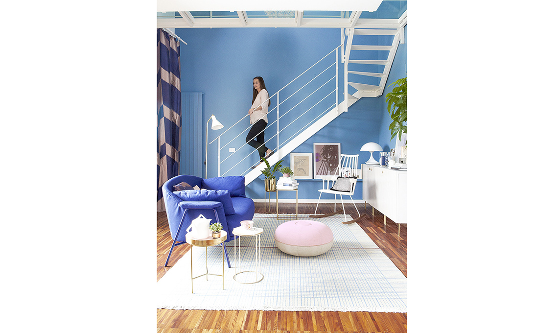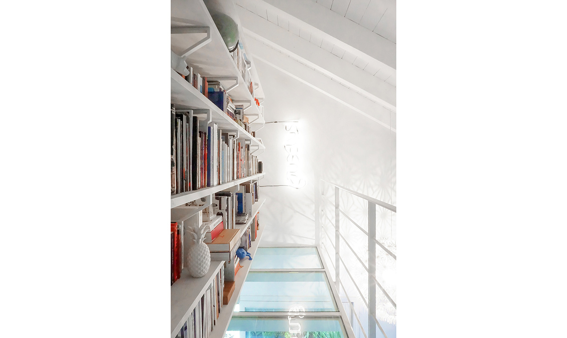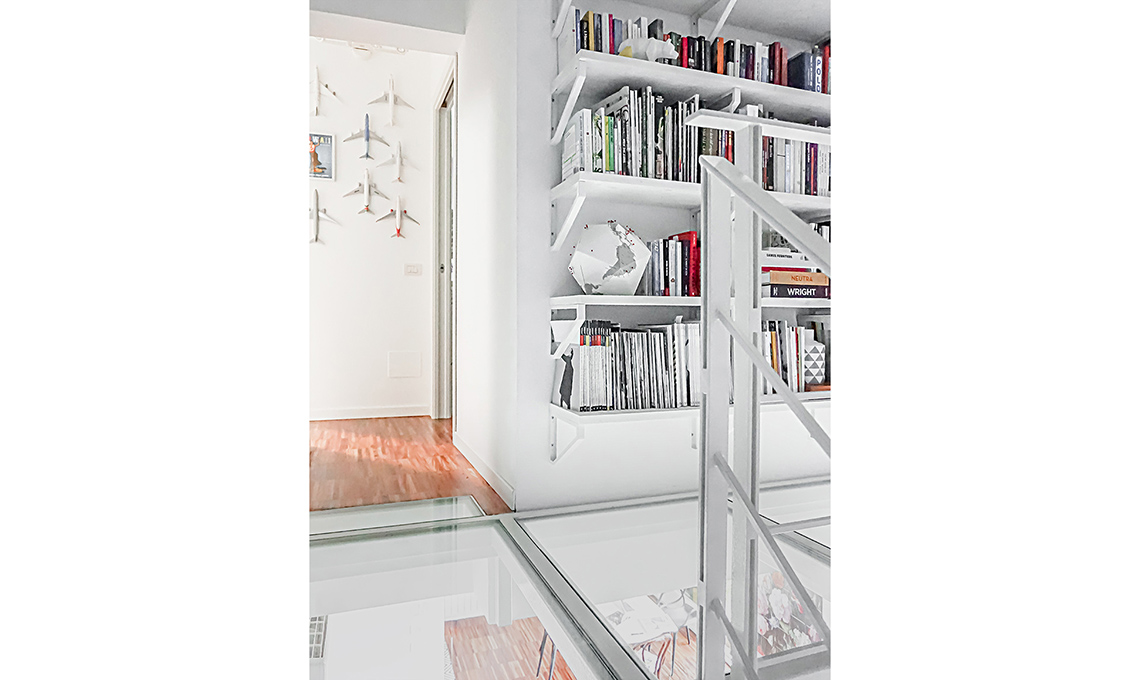 Alessandra voleva un soppalco che fosse aereo e che la luce del soggiorno filtrasse al piano di sopra. Il fabbro ha seguito il suo schizzo, e i vetri li ha realizzati il nonno, che era vetraio. La struttura è realizzata in acciaio e le lastre di vetro che compongono il pavimento sono ‘a riquadri’ per ragioni statiche.