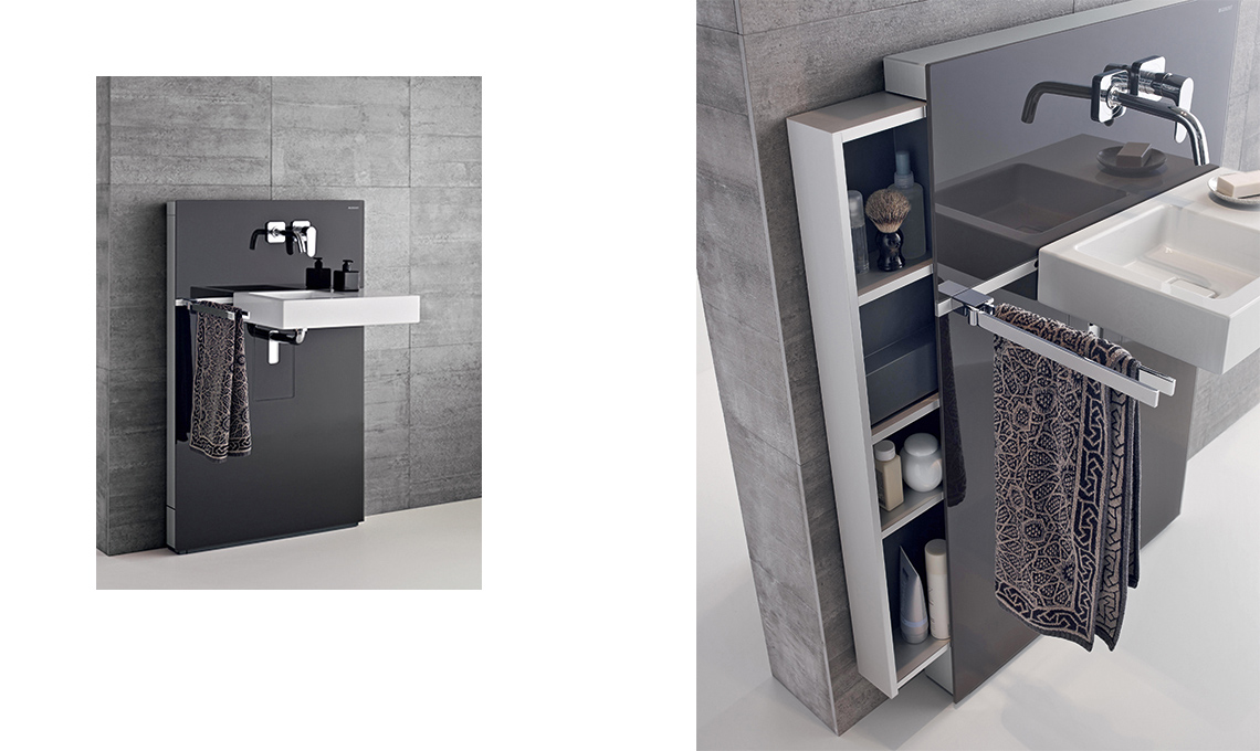 COLLEGATO AL SISTEMA IDRICO esistente, il modulo Monolith evita interventi murari per l’installazione a parete del nuovo lavabo, accessoriato con funzionali vani laterali a scomparsa. L’allacciamento alla rete viene nascosto dalla struttura, rivestita da un vetro di sicurezza ad alta resistenza [Geberit].