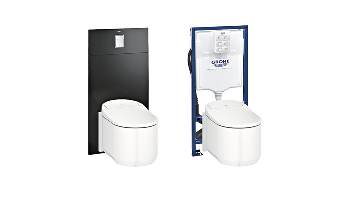 NON RICHIEDE OPERE MURARIE il modulo sanitario Grohe che permette l’installazione in appoggio alla parete del vaso sospeso con funzione bidet integrata Grohe Sensia Arena: basta collegare il modulo agli scarichi esistenti, senza dover effettuare modifiche strutturali [Grohe].