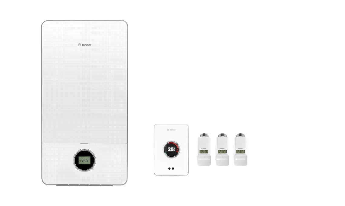 Per l’appartamento: caldaia a condensazione a gas Condens 7000i W connotata da un rapporto di modulazione della potenza pari a 1:8 e dotata di regolazione climatica intelligente con il termostato digitale EasyControl CT200, abbinabile alle teste termostatiche smart, da applicare sulle valvole dei radiatori [Bosch]
