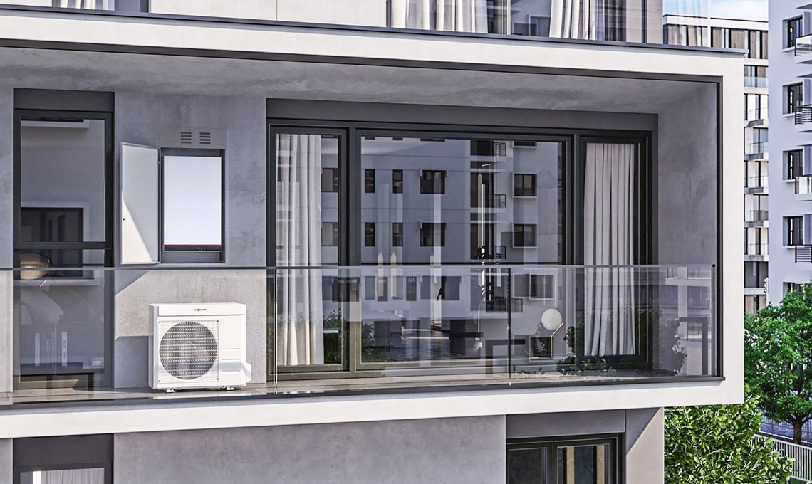 Per l’appartamento per una famiglia di 4 persone: sistema ibrido salvaspazio Vitodens 100-E Hybrid composto da una caldaia murale compatta a condensazione a gas da 25 kW di potenza e da una pompa di calore monobolocco Vitocal 100-A. Entrambi gli apparecchi sono pensati per l’esterno [Viessmann]