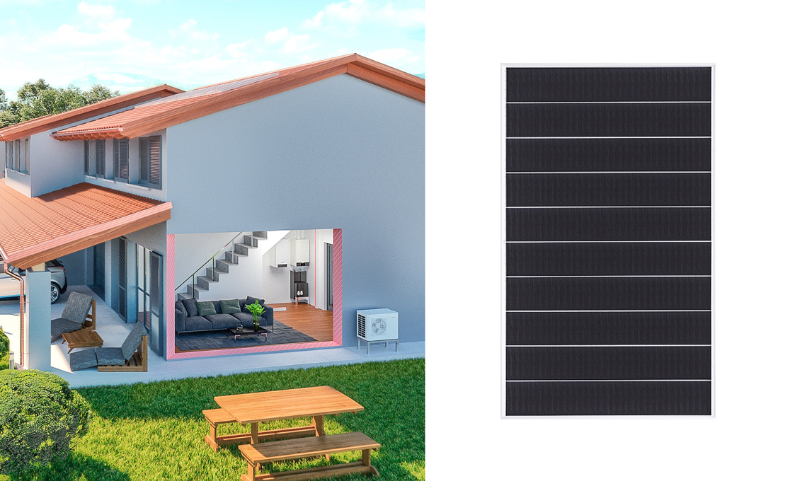 Per l’appartamento e la villetta da 110-140 mq per 4 persone: pompa di calore aria-acqua Vitocal 200-S per il riscaldamento e il raffreddamento integrata con l’impianto fotovoltaico Vitovolt da 6 kW e il sistema di accumulo Vitocharge da 12 kWh. Una soluzione sostenibile per eliminare le fonti energetiche fossili e che, in perfetta sinergia, azzera il costo annuale del gas con un risparmio annuo complessivo dell’85%, pari a circa €940 (€380 grazie alla pompa di calore e €560 grazie all’impianto fotovoltaico con accumulo). La pompa di calore beneficia delle detrazioni fiscali del 65% con sconto immediato in fattura, l’impianto solare con accumulo del Bonus Casa 50% [Viessmann]