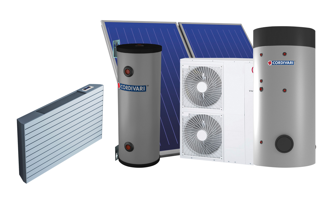 Per villette fino a 350 mq con 4/7 persone: sistema integrato Comfort Box® Solar composto dalla pompa di calore con serbatoio di accumulo e dai pannelli solari termici, abbinato ai radiatori ventilati Sofi® HC, in acciaio [Cordivari]