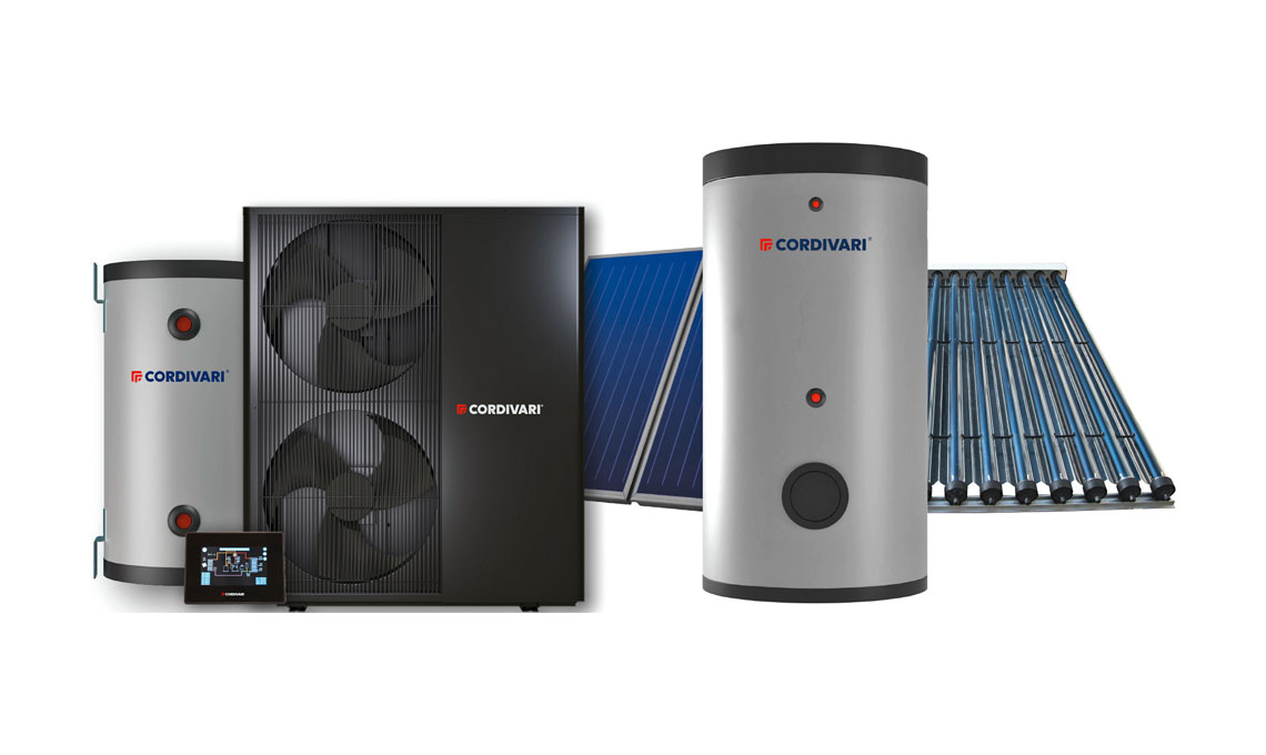 Sistema integrato Vestalis® Solar con tecnologia refrigerante a basso impatto ambientale e composto da pompa di calore ad alta temperatura, bollitore o termoaccumulatore per l’acqua calda sanitaria e pannelli solari termici completi degli accessori [Cordivari]