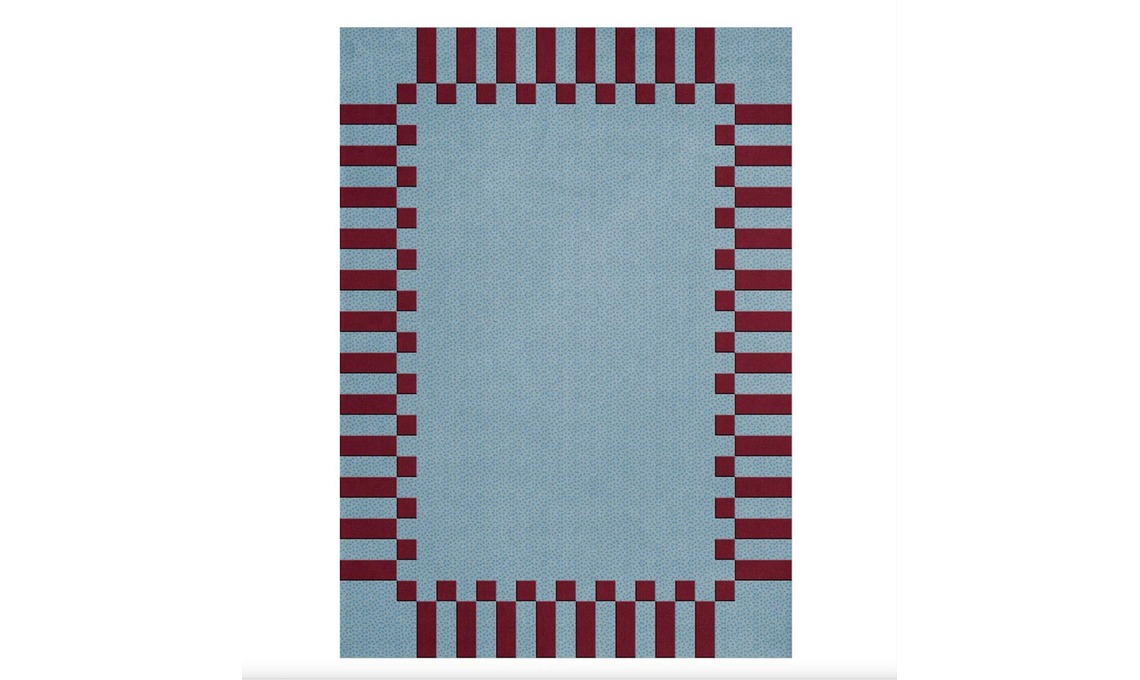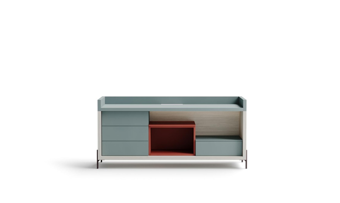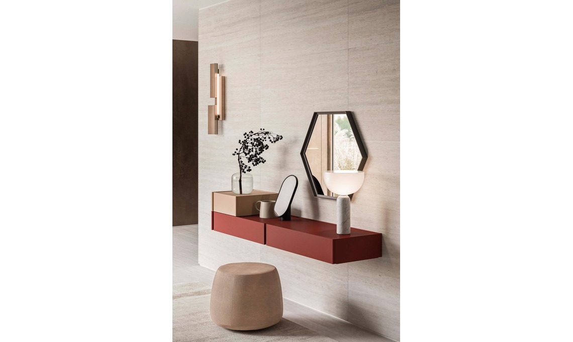 L’angolo toeletta ha 2 moduli Da-Do System in laccato opaco Amaranto e Nude [cm 178x45x19,8h e cm 45x45x19,8h], specchio Esagona [cm 80x69,3h] e pouf Denny [ø cm 55x42h], tutto di [Alf DaFrè].