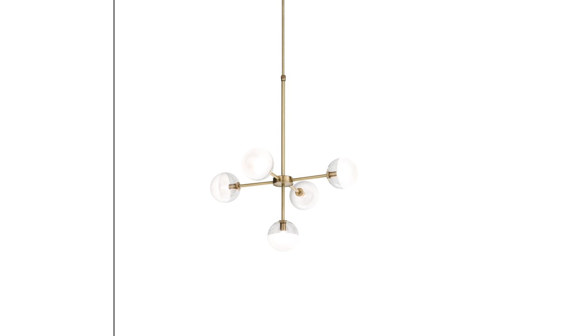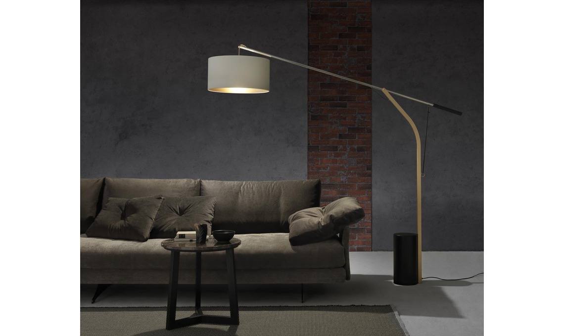 Dotata di braccio regolabile in altezza, la lampada da terra Aria ha il fusto in oro spazzolato, l’asta cromata e il paralume in tessuto avorio con interno oro [Italamp,