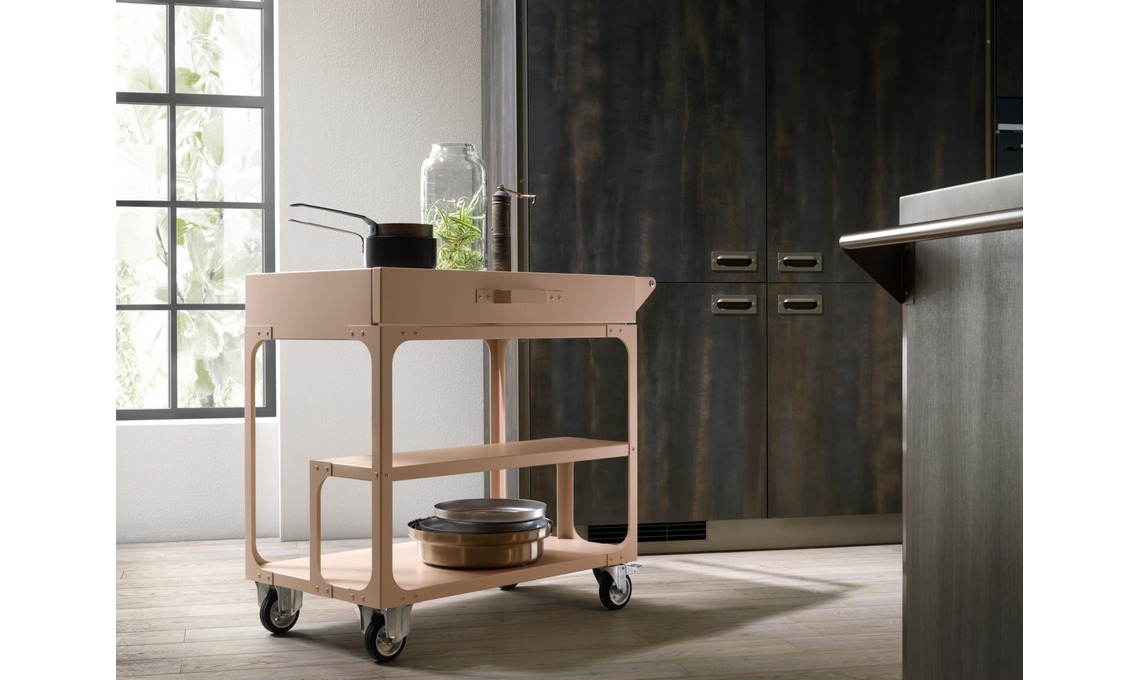 leggero, il carrello portavivande Misfit Cart della cucina Diesel Get Together è su ruote piroettanti bloccanti ed è dotato di un cassetto capiente. In metallo verniciato, qui è nel colore Dust Pink [Scavolini, cm 52x91x83h].