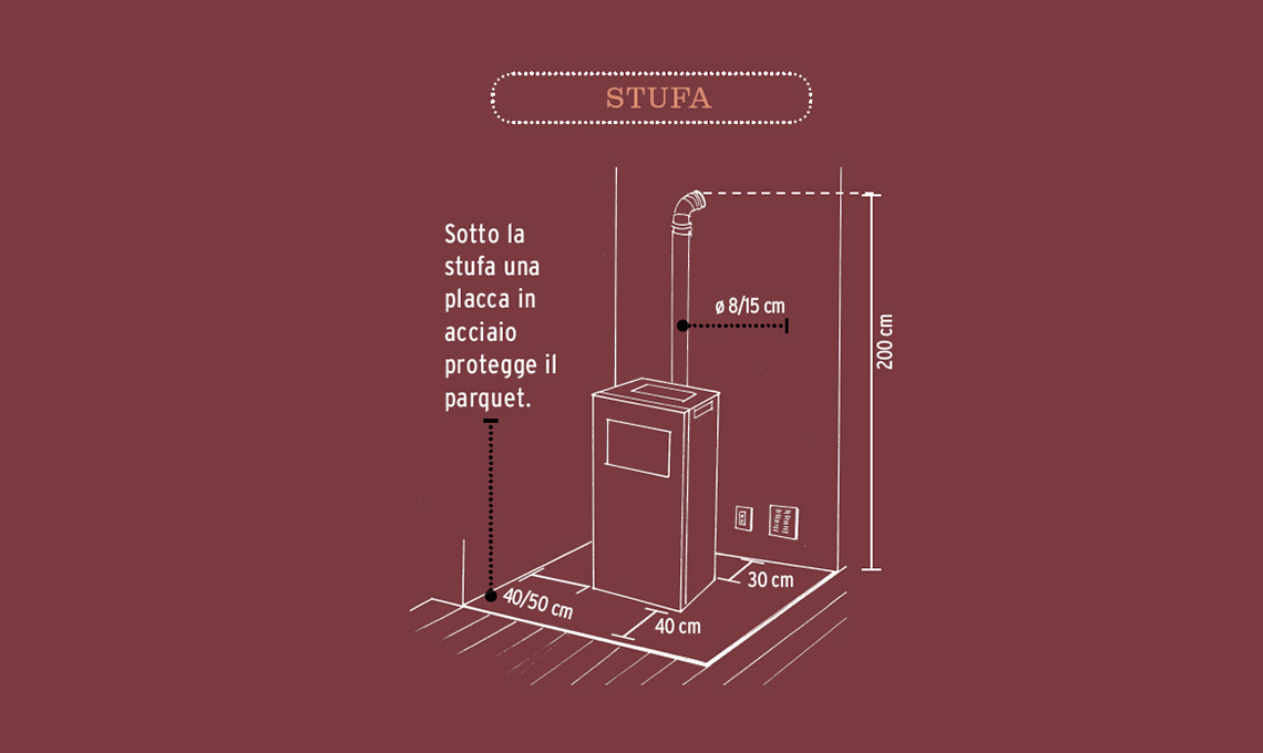 La presa di corrente va posta a cm 20/40 dalla stufa; la presa d’aria nel muro deve avere superficie di 200 cm2. Sotto la stufa una placca in acciaio protegge il parquet.