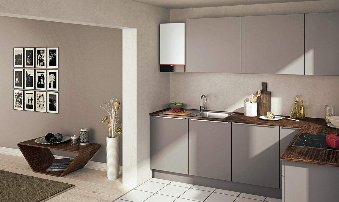 la caldaia a condensazione agasVitodens100-W,inclasseA,èl’ideale nelle sostituzioni. Compatta, silenziosa, leggera ed efficiente, si integra in modo facile e perfetto in ogni casa [Viessmann, cm 40x36x70h su progetto].