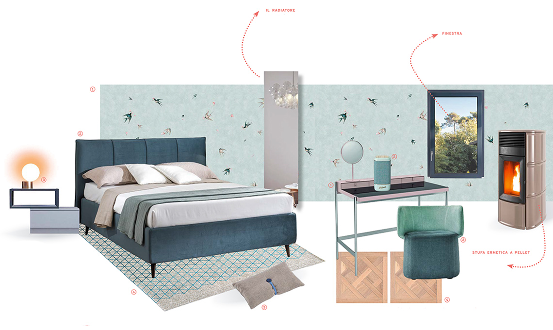 A sinistra: 1 Carta da parati Bird Panorama, Coll. Camere, qui stampata sul supporto dalle alte performance tecniche (T)ech, facilmente lavabile e ignifugo. È stampabile anche su altri materiali [Texturae]. 2 Letto contenitore Line della gamma Smart, dall’elegante testata imbottita e arricchita da impunture verticali. Il contenitore da 30 cm si solleva a compasso [PerDormire, cm 160x190]. 3 Comodino Bridge, qui nelle finiture laccato opaco Bianco, nobilitato Gesso e telaio Grafite [Giessegi, cm 85x51,4x48h]. 4 Tappeto Apotema realizzato in tessitura jacquard [Calligaris, cm 170x240]. 5 Cuscino décor con bottone e passante in lana, disponibile in più colori e rivestimenti [Egoitaliano, cm 25x40]. A destra: 1 Toeletta PS20, dotata di ampi scomparti con due cassetti scorrevoli, specchio, e piano in cristallo nero [M ller, cm 100x65x81]. 2 Speaker Bluetooth® Beacon 320, dal look squisitamente vintage [Roberts,