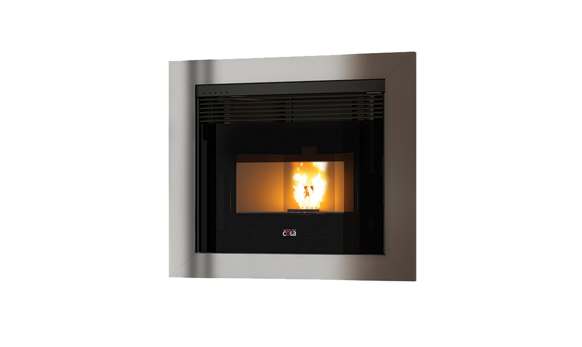 L’inserto a pellet estraibile: Top Fire 70 con camera di combustione ad alta resa e ventilatore centrifugo riscalda volumi di 295 mc. È dotato di porta con vetro ceramicato serigrafato e la finitura è personalizzabile in base alle esigenze [Anselmo Cola].