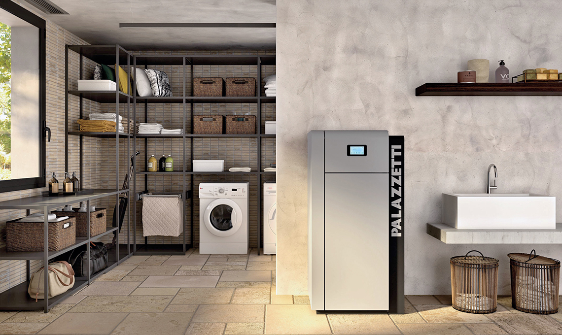 Caldaia a pellet JP 21 ad alta resa con 4 stelle, dotata di kit idraulico per l’acqua calda sanitaria. Ha un sistema di autopulizia del braciere che si attiva in automatico [Palazzetti, cm 70x 63x140h €8.270].