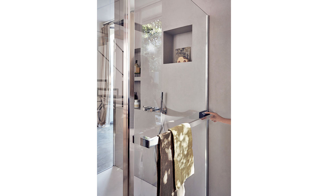 La Parete Radiante con comandi sulla barra portasalviette qui è integrata nel box doccia Serie 8000. Riscalda il bagno anche senza radiatore [Vismaravetro, il box da cm 100x80x195h € 3.825].