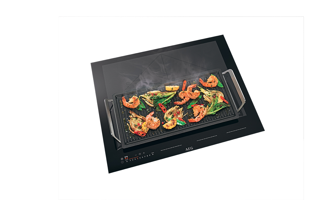 La superficie in vetro del piano a induzione TotalFlex IKE64683FB rileva in automatico le varie forme e dimensioni delle pentole e crea una zona di cottura dedicata [Aeg,