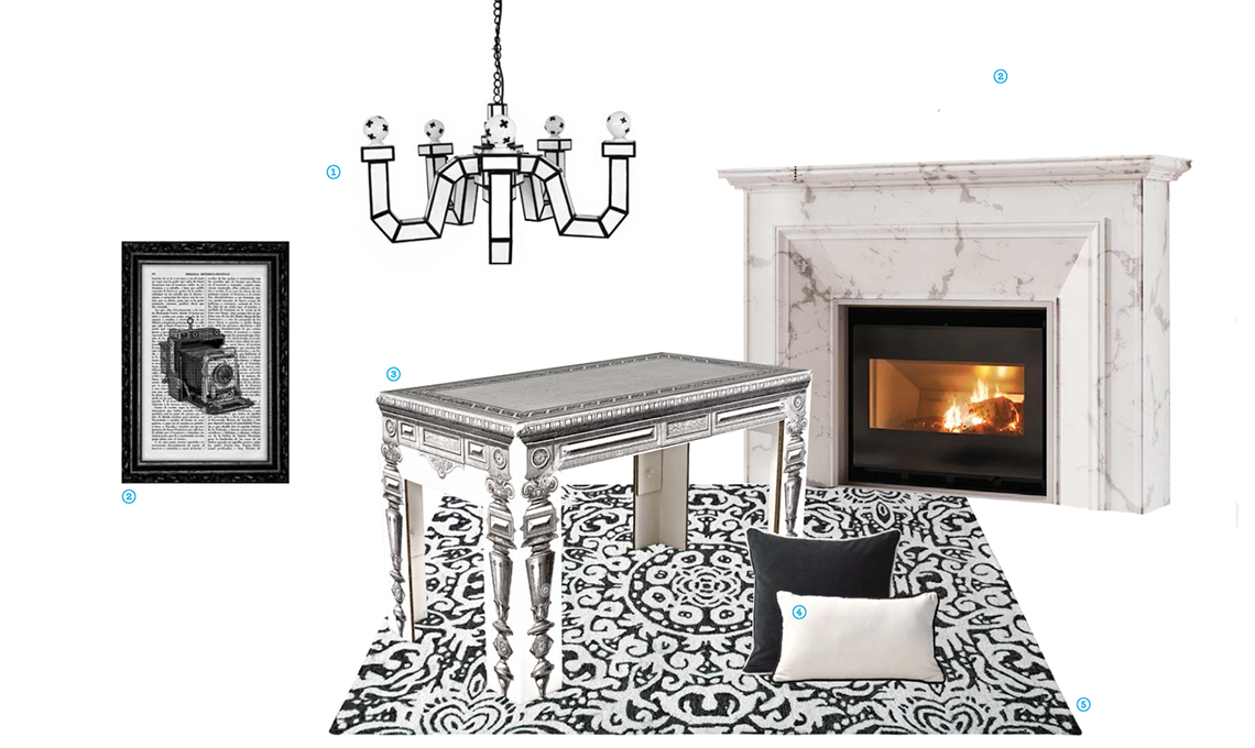 1 sospensione Cut ‘N Paste, in cartone riciclato [Seletti, ø cm 90x48h]. 2 stampa Old Camera, su fogli di vecchi dizionari destinati al macero [The Purple Hamster, cm 18x27]. 3 tavolo Luigi XVI, in cartone riciclato e stampato con forme e decori del settecento francese [Corvasce, cm 130x 80x70h]. 4 cuscini Bronte in velluto riciclato [CB2, cm 50x30 da]. 5 tappeto Arley in plastica riciclata [Fab Habitat, cm 152x244].