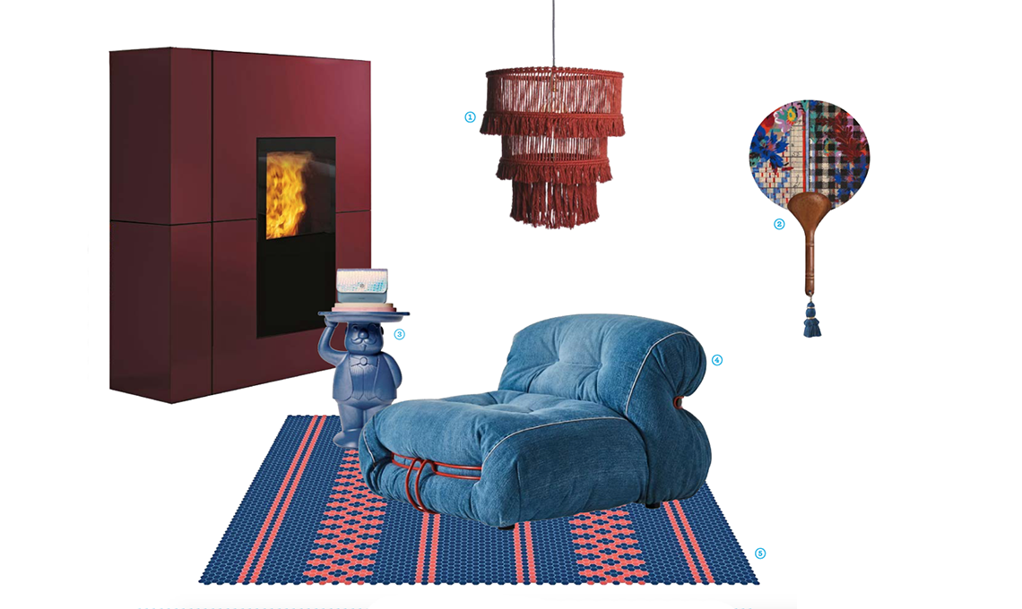 1 sospensione Chandelier, in cotone riciclato [Heather Orr, ø cm 50x45h]. 2 ventaglio Midori, in fibre di legno riciclate [Miho Unexpected Things®]. 3 tavolino Ambrogio, realizzato in plastica e materiale riciclato dai cartoni in Tetra Pack [Slide, cm 42,5x38,5x60,5h]. 4 poltrona Soriana in denim sostenibile e materiali riciclati [Cassina, cm 71x95x195h]. 5 pavimento Cefalu in vetro riciclato [Vidrepur, cm 31x31].
