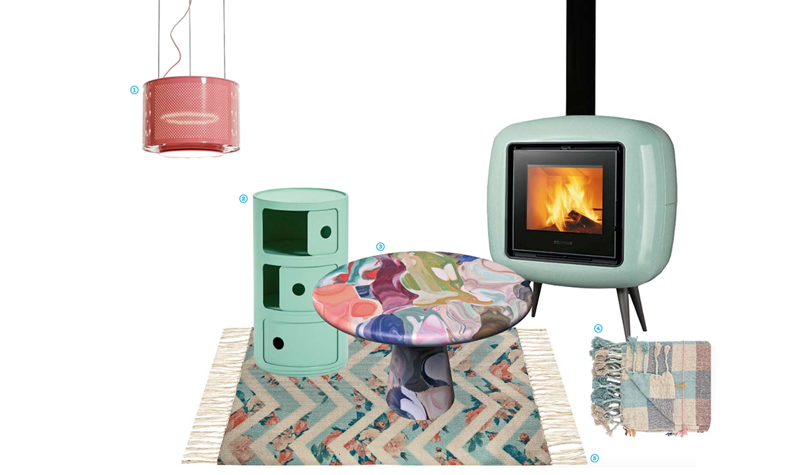1 sospensione Eco Drum Lamp, realizzata recuperando un tamburo di lavatrice [Willem Heeffer]. 2 contenitore Componibili Bio, in bioplastica composta da materie prime derivate da fonti rinnovabili di provenienza agricola [Kartell, ø cm 32x58h]. 3 tavolo Meltingpot in plastica riciclata [Kooij, ø cm 120x78h]. 4 plaid in cotone riciclato Mille [Bloomingville, cm 45x45]. 5 tappeto Zigzag in poliestere riciclato [Fatfatiya, cm 60x90].