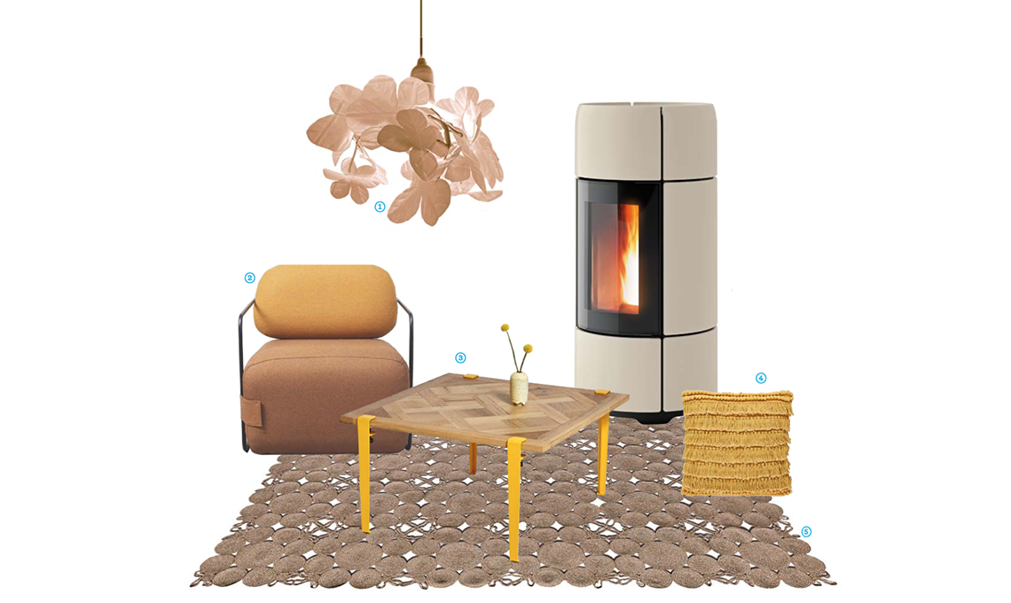 1 sospensione White Flowerleafs, in plastica riciclata assemblata a mano [Mum’s]. 2 poltroncina UChair, in lana e poliestere riciclato [Marine Peyre Editions, cm 72x62x80h]. 3 tavolino Versailles, con piano in rovere riciclato [Tiptoe, cm 80x80x43h]. 4 cuscino in cotone riciclato Fabulous [Joe Browns, cm 45x45]. 5 tappeto Pet Lover Join, in filato di PET ricavato dal recupero della plastica gettata in mare [Sitap, cm 160x230].