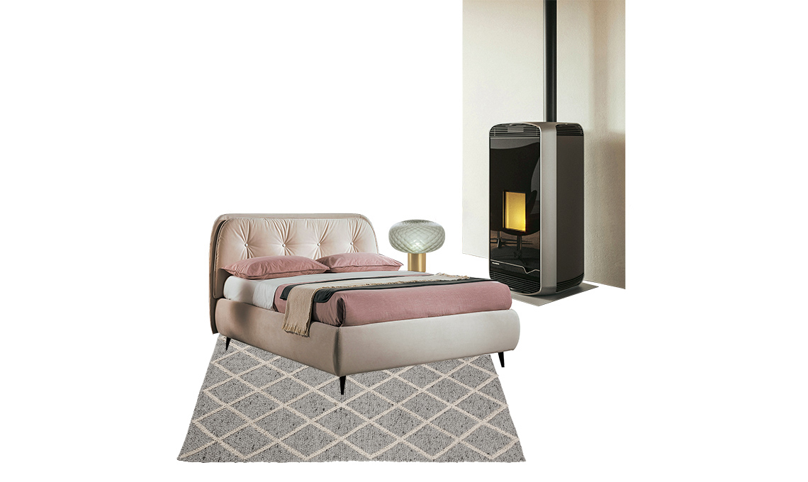 Per godere della magia della fiamma dal letto, puoi scegliere una stufa ‘ermetica’, l’unica ammessa perché non ruba ossigeno alla camera ma preleva l’aria che le serve per la combustione direttamente dall’esterno tramite un doppio tubo speciale, e non richiede la classica presa d’aria. Scegli il modello a pellet Ecofire® Meghan Acciaio Moka, certificata 4 stelle. Ha il top e la base in alluminio e fianchi in acciaio verniciati e grazie al sistema di gestione dell’aria Flex AIR è possibile orientare il flusso d’aria calda frontalmente, verso l’alto o in entrambe le direzioni [Palazzetti].